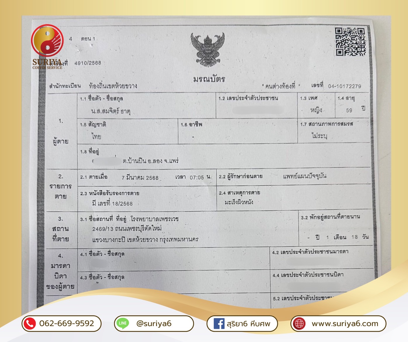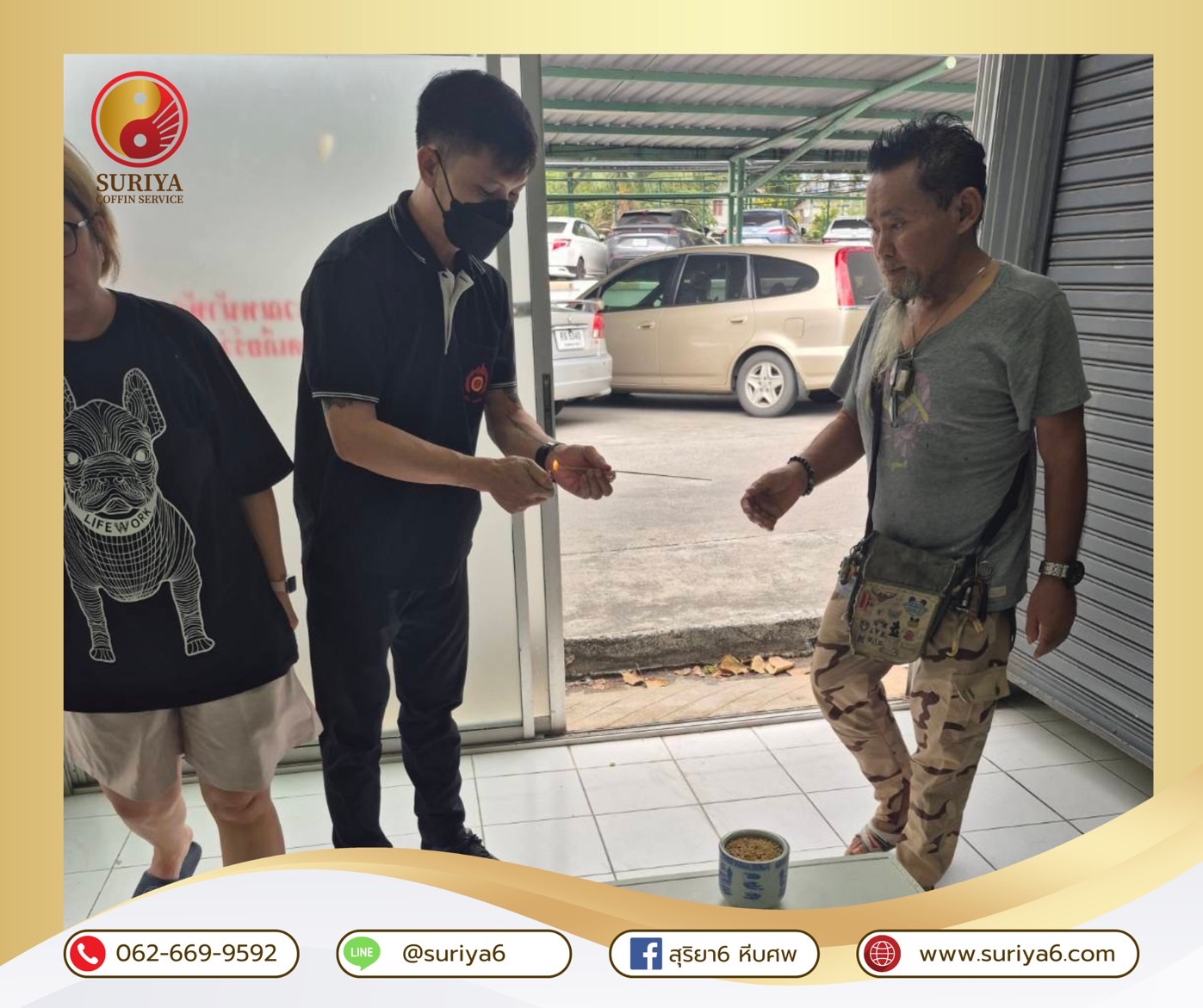 ทางสุริยา6หีบศพ ขออนุญาตเป็นสื่อกลางในการนำหีบศพไปบริจาคแก่ผู้ที่มาขอรับบริจาค โดยรับจาก รพ.เพชรเวช ไปส่ง วัดโพธิบุปผาราม จ.แพร่ เมื่อวันที่ 8 มีนาคม 2568 โดยทางสุริยา6 หีบศพ ได้ส่งมอบให้กับทางญาติของผู้เสียชีวิตเป็นที่เรียบร้อยแล้ว และ ณ โอกาศนี้โอกาสนี้ทางสุริยา6 หีบศพต้องขอขอบพระคุณผู้ร่วมบริจาคทุกท่านและขออนุโมทนาบุญกุศลในครั้งนี้จงดลบันดาลให้ท่าน ครอบครัว และบุคคลอันเป็นที่รักทั้งหลาย จงมีแต่ความสุขสวัสดิ์ เจริญรุ่งเรือง ก้าวหน้าในชีวิต มีทรัพย์เหลือล้น ด้วยเทอญ